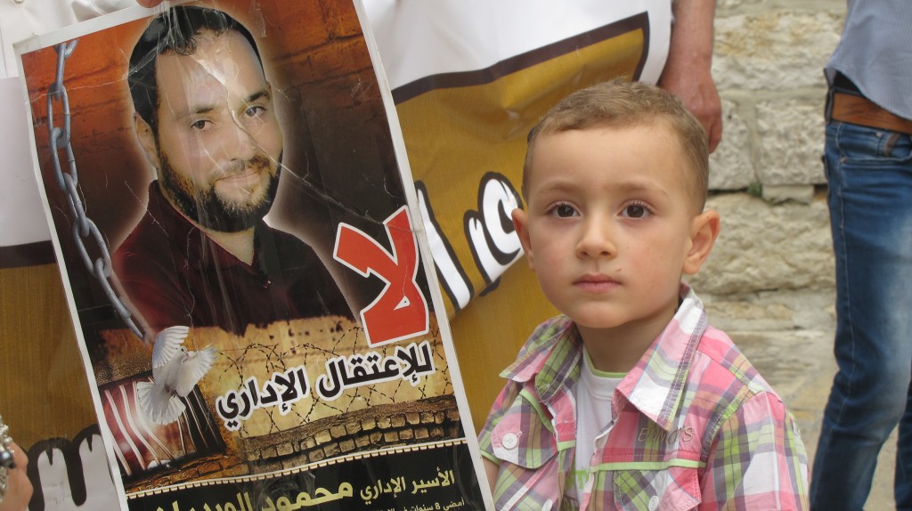Nästa dag möter jag Abdullah utanför Födelsekyrkan i Betlehem. Det är dag 43. Turisterna strömmar in och ut ur kyrkan. De höjer sina kameror mot Omarmoskéns vackra minaret och mot kyrkspirorna. De skrattar och pratar, ivrigt och högljutt. De flesta ser oss inte. Vi, som står där med våra kameror riktade mot de stora banderollerna som hålls av tidigare fångar och av familjemedlemmar. Vi böjer oss ner för att fånga in barnen i våra kameralinser; barnen som håller plakat med foton av sina pappor. Det är män som ser på oss med intensivt sorgsna och allvarsmättade blickar. Så också Mahmoud al-Wadiyan. Men Mahmouds pappa som står bakom en av banderollerna ler varmt mot oss medan han hjälper sonsonen Hassan att hålla sin skylt rak. Mahmouds pappa har tillbringat tretton år i fängelse, sonen Mahmoud sju år. Därtill de senaste tio månaderna i administrativt förvar. (6) Han är en av drygt 120 som hungerstrejkar. Mahmouds son Hassan har en lillasyster. Jag tänker på henne medan jag försöker greppa situationen. Jag funderar över om Hassans lillasyster har något minne av sin pappa. Han, som är en av dem som räknar sekunder.