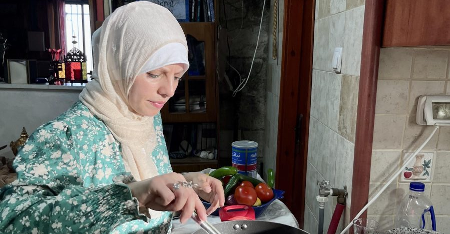 En magnifik vy över gamla stan i Jerusalem sprider ut sig där vi står på innergården i solnedgången. Vi stiger in i familjen Bukharis hem för att lära oss mer om palestinsk matkultur. Många timmar senare har vi delat en måltid men också fått ta del av den förödelse som följer i ockupationens spår.