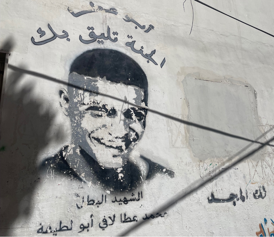 Yazan ligger begravd i flyktinglägret och vägen dit följer längs smala gränder, kantade av slitna hus, prydda av palestinska flaggor som vajar i den ljumma vinden. Rawans bror, Muhammed, har anslutit, och här och var stannar han till, pekar, och berättar att på den här gatan bor en, ofta två och ibland så många som tre mödrar till dödade unga män. Runt omkring är fasaderna täckta med budskap och bilder till minne av alla dem som mist livet. Hela Qalandiya är tatuerat av sorg över saknade och förlorade söner.