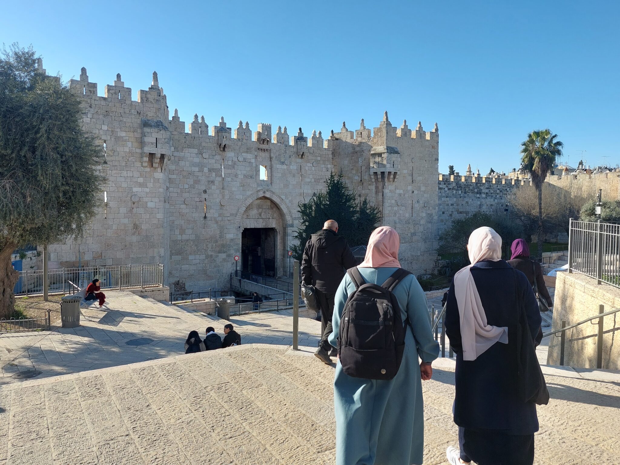 Två breda trappavsatser går ner mot porten i den historiska muren. Vid varje trappa står militärens vakttorn, oftast bemannade med minst fyra poliser vardera. De ska upprätthålla ordning, vilket innebär att de bestämmer vilka som får komma in i gamla stan. Vi bevittnar personer kroppsvisiteras, väskor och id-kort som granskas. Men ibland bryr sig gränsvakterna inte ens om att titta på något, utan bara viftar bort dig. Att ständigt riskera att bli kontrollerad och ifrågasatt är vardagen för många här. Vid stora bönetillfällen, som vid fredagsbönen mitt på dagen, är kontrollen än striktare och järnstaketen som avgränsar nedgångarna än fler, något vi nu märkt av.
