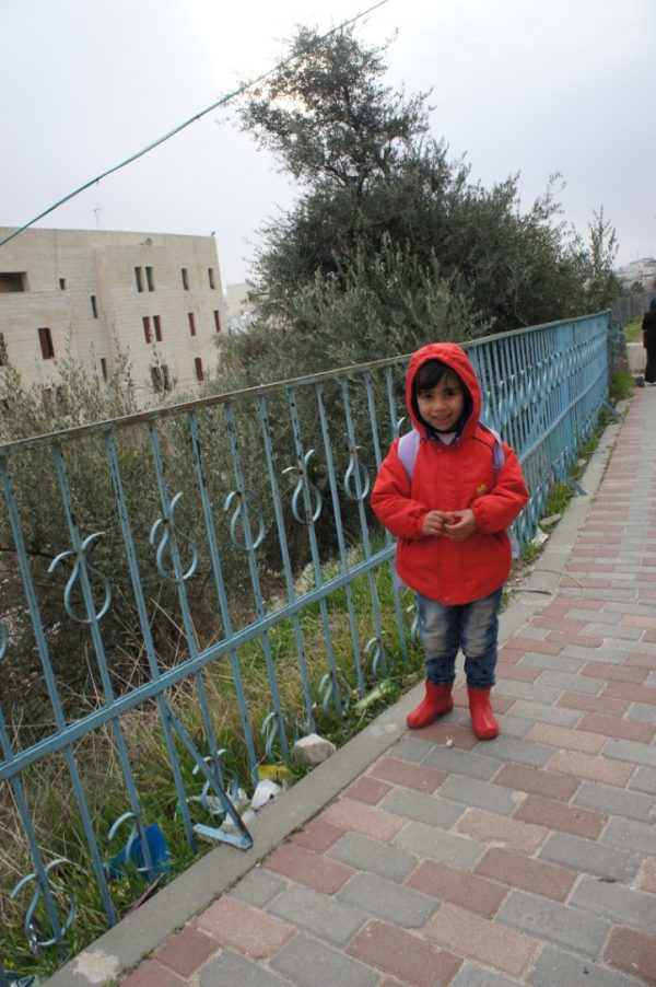 Jag ges tillfälle att hälsa på barnen i förskolan. När jag går in i den mycket kyliga byggnaden möts jag av ett trettiotal palestinska barn, ett av barnen är femåriga Bushra. Mitt hjärta fylls av sorg när jag ser Bushra i ögonen där hon sitter, lite ihopkrupen i sin skolbänk med den röda jackan på. Bushra är ett av barnen som jag redan min första dag i fält lagt märke till. Inte för att den röda jackan får henne att sticka ut, utan för att Bushra har en karisma som skiljer henne från de andra. Jag undrar vad hon tänker om att hon måste passera militära vägspärrar för att ta sig till sin förskola. Jag undrar om även Bushra har normaliserat denna orättvisa.