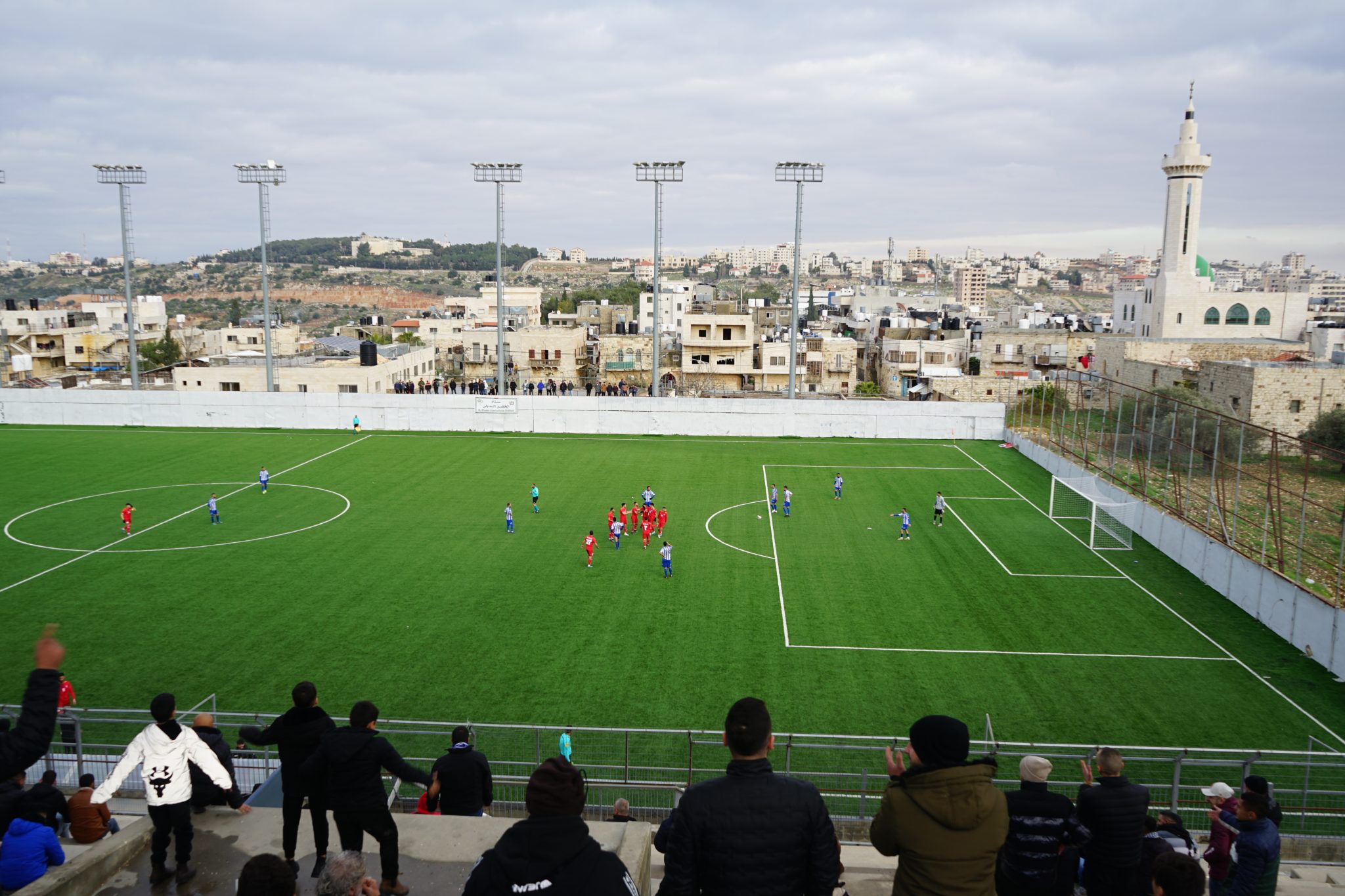 Drygt fyra kilometer åt sydväst ligger den största arenan i Betlehem, Al Khader International Stadium. Hemmahörande fotbollslag är Taraji Wadi al-Nes. Dagen som fotot nedanför är taget ifrån tog herrlaget emot Hilal al-Quds, inför omgången placerad som tabelltvåa i West Bank Premier League. Dagens match blir aldrig riktigt spännande, då gästerna dominerar matchbilden, och i den 29:e minuten tar de ledningen genom att hemmalaget gör ett självmål. På övertid i den första halvleken utökas ledningen, och drygas ut tidigt i den andra. Strax efter drar hemmalaget också på sig ett rött kort. Slutresultatet landar tillslut på 0-5. Jag hade ynnesten att stå i bortaklacken, där stämningen var betydligt bättre än på hemmasektionen.