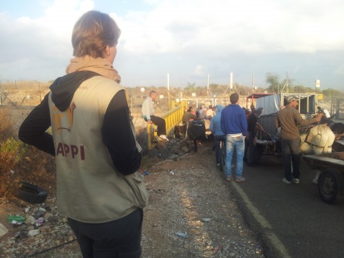 1. Min följeslagarkollega Meike vid jordbruksgrinden vid Far’un. Denna morgon var soldaterna försenade i mer än en timme vilket innebar en timme mindre arbete för lantbrukarna. Foto: Samuel Skånberg