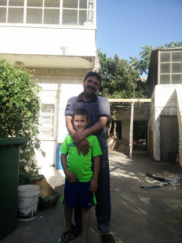 Hani Abu Haikel och hans son framför familjens hus. Den som tittar noga kan se en kamera bakom galler längst upp i bild. Foto: D. Bålman