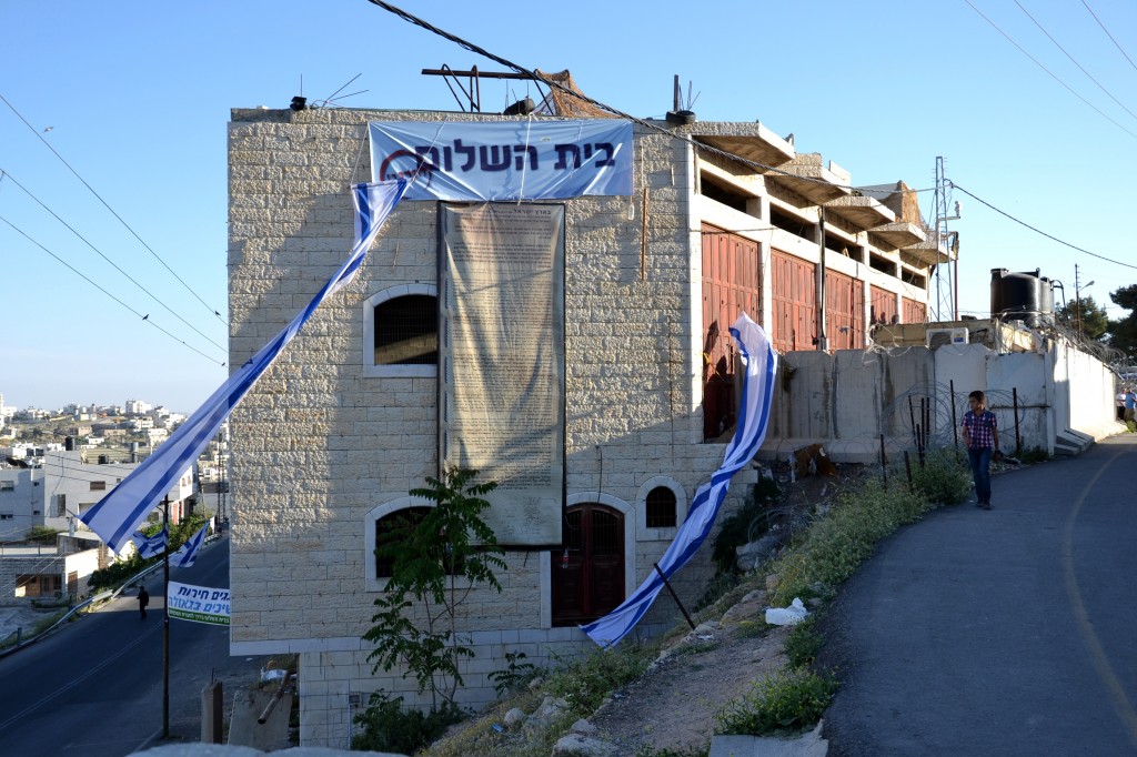 1. Rajabi-huset. Bannern visar ”Beit HaShalom” – fredens hus och under denna sitter domslutet från Israels högsta domstol som slutligen ledde till att de israeliska bosättarna kunde flytta in. Foto: Cecilia Bödker Pedersen