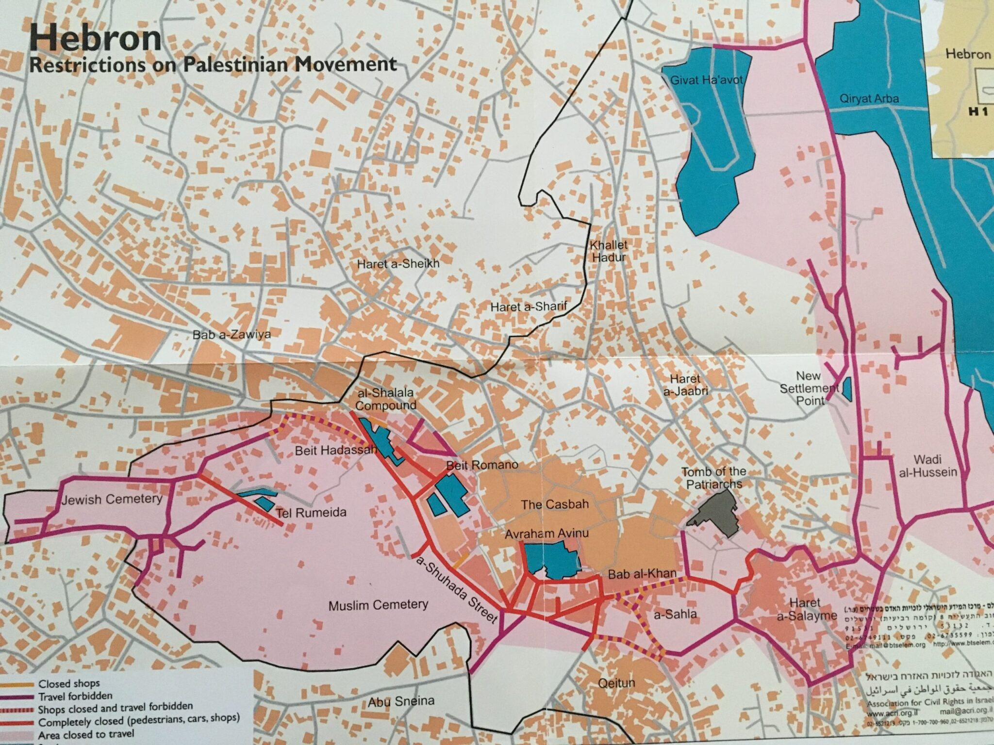 Jag upplever liksom Abed att vägspärrarna framför allt komplicerar människors tillvaro. De har dessutom lett till övergivna hus och affärer som gör att det närmast känns bisarrt att gå genom den döda och ödsliga stadskärnan. Efter att den amerikanska judiska bosättaren och läkaren Baruch Goldstein öppnat eld inne i al-Ibrahimimoskén under en fredagsbön under Ramadan 1994 och dödat 29 palestinier och skadat hundratals, stängde israelisk militär av den viktigaste marknadsgatan Shuhada i gamla stan för palestinska fordon. Man förbjöd även alla palestinska affärer längs gatan att ha öppet. År 2000 stängdes delar av Shuhadagatan fullständigt, även för palestinska fotgängare [1]. Militären förseglade ingångarna till butiker och hus. 2015 förklarar den israeliska militären H2 vara ett stängt militärt område och endast registrerade palestinska invånare som bor i det avstängda området får komma genom vägspärrarna. Över 1100 palestinska bostäder, mer än en tredjedel av lägenheterna i centrala Hebron, har övergivits. Av de palestinska företagen i området är över 1600 nu stängda [2]. Namn på gator och grannskap har ändrats från arabiska till hebreiska namn.