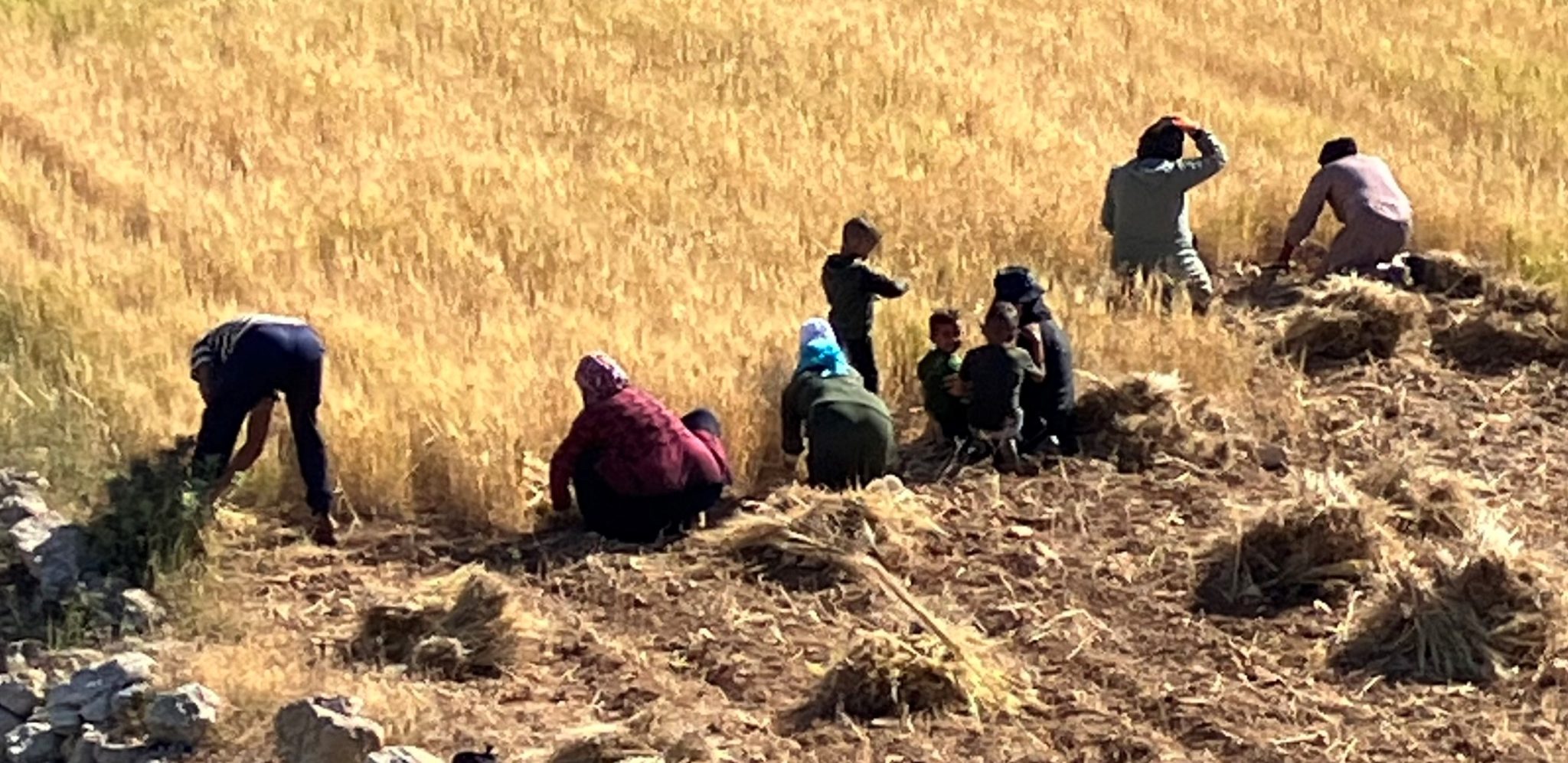 Vårt team befinner sig invid ett fält i en underbart vacker liten dal som ligger maximalt 200 meter nedanför en bosättning. Där rycker kvinnor och barn upp säden med rötterna. Det går långsamt och ger liten utdelning men det är lika mycket ett sätt att skörda som en motståndshandling. Det händer att bosättare ändå kommer ner på natten och tänder på de torra sädesbalarna så man måste skynda sig. Mohammad Jabarin, en av småbrukarna i dalen fick nästan hela sin skörd stulen nattetid av en bosättare som kom körande med – en traktor. Det är en ekonomisk katastrof för lantbrukaren.
