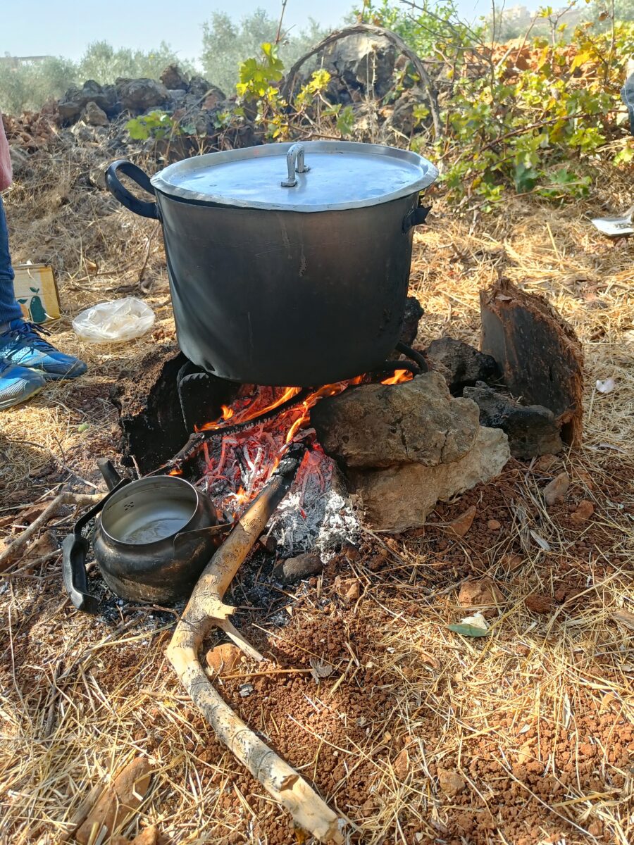 En viktig del i olivskörden är att fika och äta. Ibland ropar Shireen ”Break!”, då samlas vi och tar en kopp kaffe. Lunch tillagas på plats över öppen eld och denna dag serverades Maqluba, en traditionell palestinsk maträtt. Vi var glada att slippa närvaro av militär och bosättare dagarna när vi plockade oliver hos Shireen. Både vi och familjen kunde glömma ockupationen för en liten stund och njuta av hårt arbete och samhörighet med marken som brukats i generationer.