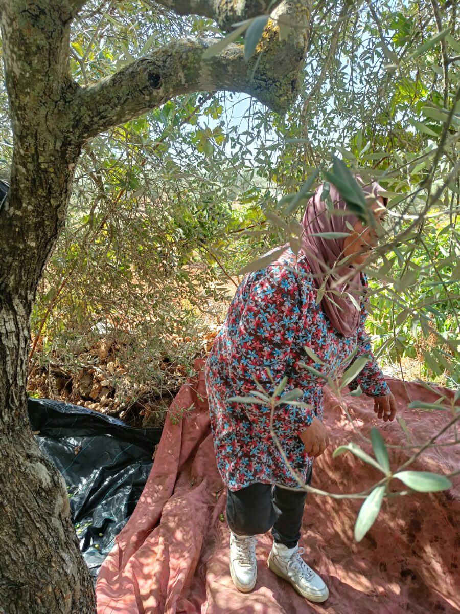 Vi blev inbjudna av Shireen att plocka oliver under några dagar, tillsammans med hennes familj, i familjens olivlundar nära byn Wadi Fukin som ligger mellan bosättningen Beitar Illit och gränsen till Israel. Där fick vi uppleva en familjefest med barn som leker och sjunger, mat lagad över öppen eld, mycket kaffe och hårt arbete. Vi plockade oliver från stegar och ibland klättrandes i träden.